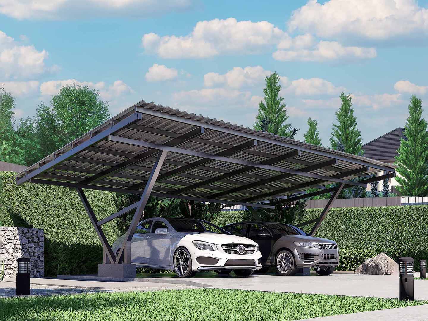 Навесы из металлопрофиля имеют легкий вес и строгий внешний вид, гармонично вписывающийся в ландшафт.